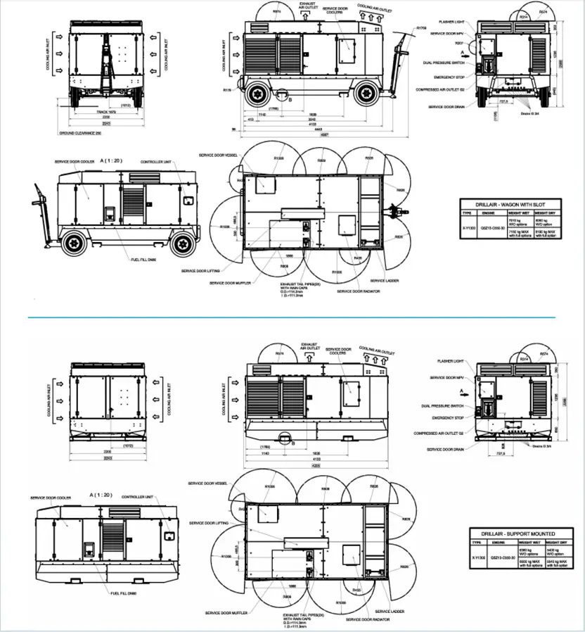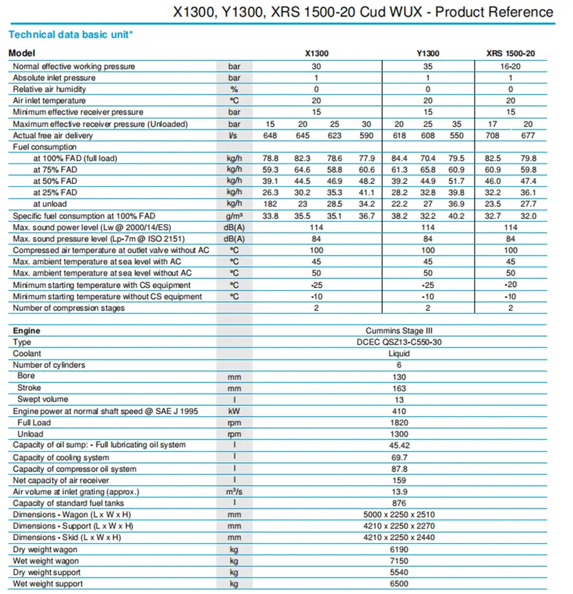 Atlas Copco X1300, Y1300 și XRS 1500-20 sunt compresoare cu șurub silențioase, în două trepte, cu injectare de ulei, alimentate de un motor diesel Cummins cu șase cilindri, răcit cu lichid.