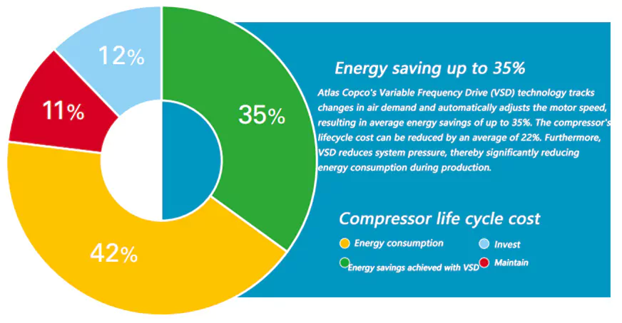 Consumul de energie reprezintă peste 80% din costul total al ciclului de viață al unui compresor de aer cu șurub fără ulei. În plus, electricitatea utilizată în producția de aer comprimat reprezintă peste 40% din costurile totale ale unei fabrici cu energie electrică. Pentru a reduce costurile cu energia, Atlas Copco a fost pionier în tehnologia Variable Frequency Drive (VSD) în industria aerului comprimat. VSD nu numai că economisește cantități semnificative de energie, ci și protejează mediul pentru generațiile viitoare. Datorită investițiilor continue în această tehnologie, Atlas Copco este capabil să ofere cea mai largă gamă de compresoare VSD integrate de pe piață.