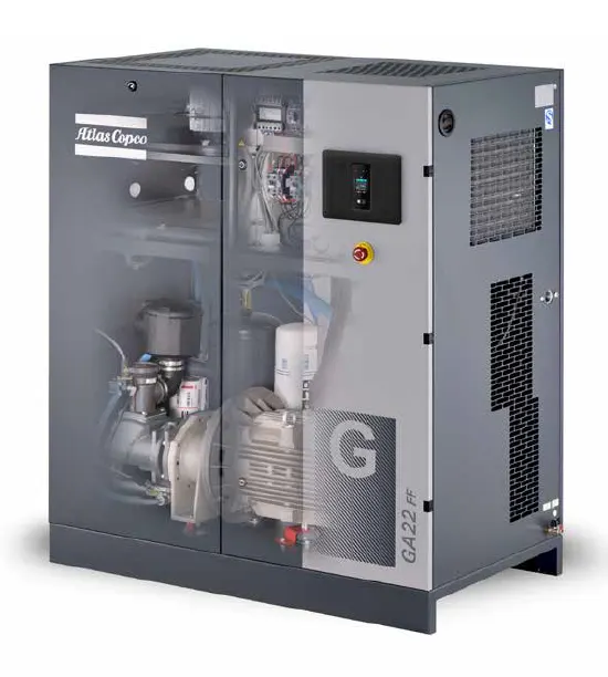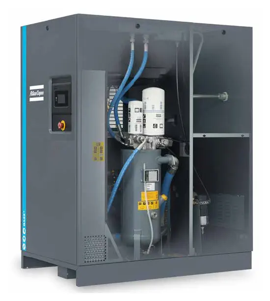 · Compresorul cu șurub cu injectare de ulei utilizează trenul de transmisie central Atlas Copco și cutia de viteze eficientă pentru o fiabilitate foarte ridicată