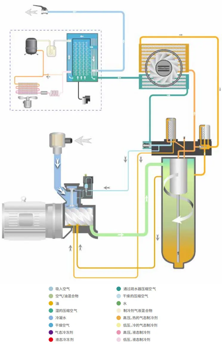 ·Uscătorul încorporat adoptă un schimbător de căldură în contracurent, un separator de apă încorporat și poate regla uscătorul în funcție de sarcina compresorului de aer.