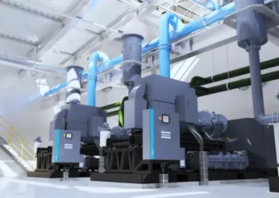 Pe lângă designul central eficient din punct de vedere energetic, turbocompresorul nostru cu o singură treaptă poate fi combinat cu o unitate de recuperare a energiei și un controler central și/sau unității pentru a reduce și mai mult amprenta de carbon a procesului dumneavoastră de producție: