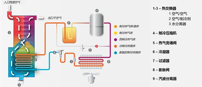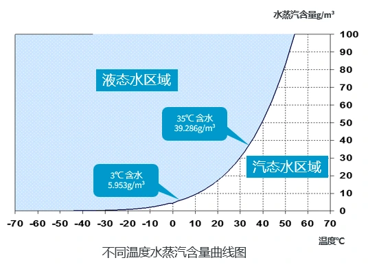 Figura arată că aerul reține cantități diferite de vapori de apă la diferite temperaturi. Aerul se răcește, iar nivelul de vapori de apă scade și el. Curba are puncte care marchează nivelurile de vapori de apă saturati. Temperatura pentru fiecare dintre aceste puncte este punctul de rouă. Un punct de rouă mai scăzut înseamnă mai puțini vapori de apă în aerul comprimat. Uscatoarele cu aer frigorific folosesc aceasta regula fizica. Ei lasă aerul comprimat să schimbe căldura cu agentul frigorific. Această acțiune scade temperatura aerului comprimat. Vaporii de apă ai aerului răcit se transformă în apă lichidă. Acest lichid se scurge din sistem. De exemplu, conținutul de vapori de apă saturați al aerului comprimat la 35℃ este de 39,286 g/m³. După schimbul de căldură cu agentul frigorific și răcirea la 3℃, conținutul de vapori de apă saturați este de 5,953 g/m³. Diferența de 33,333 g/m³ indică cantitatea de apă îndepărtată după răcire și deshidratare de către liofilizator. Adică, după ce aerul comprimat trece prin liofilizator, aproximativ 85% din umiditate este îndepărtată, asigurându-se că uscarea aerului comprimat îndeplinește cerințele procesului de producție.
